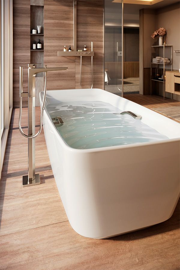 Không gian phòng tắm sang trọng sử dụng nhiều vật liệu khác nhau với sự kết hợp của tông màu ngà. Ánh sáng gián tiếp từ dải đèn âm trần được lắp đặt trên nền trần mạ vàng mang lại ánh sáng dịu nhẹ cho phòng tắm. Các sản phẩm vòi rửa và đường cong mềm mại của bàn cầu được mạ nicken lấp lánh, tạo nên sự cân bằng hài hòa và trang nhã bên trong căn phòng. Tổng thể không gian sẽ đem đến cho bạn sự thư giãn trọn vẹn, khi phóng tầm mắt ngắm nhìn toàn bộ cảnh quan tráng lệ của đô thị về đêm.