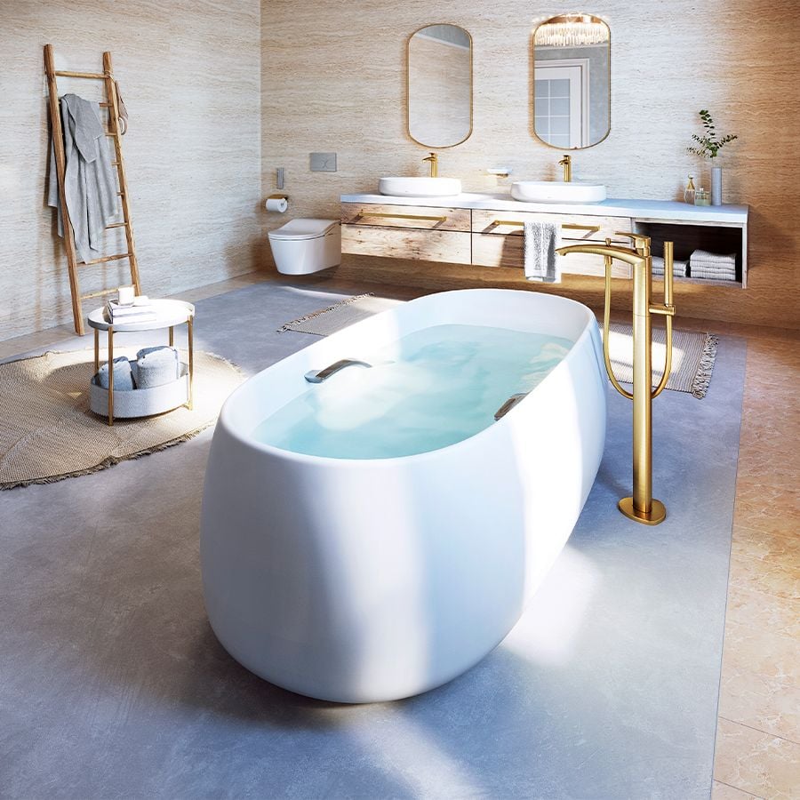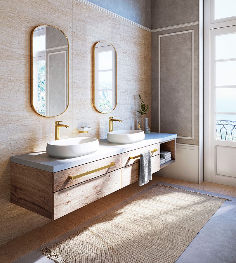 Thêm vào đó, vòi chậu chất liệu đồng mờ tăng thêm cảm giác ấm áp mời gọi cho toàn bộ không gian.